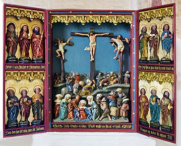 Midterskabet viser korsfæstelsen og i sideskibene ses de 12 apostle.