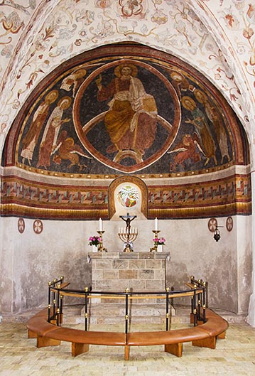 Det imponerende romanske kalkmaleri i apsishvælvingen er kirkens stolthed, og lige så gammelt som kirken.