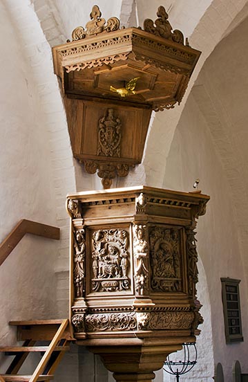 Prædikestolen er et imponerende træskærerværk fra 1624, udført af den berømte billedskærer Hans Holst fra Køge.